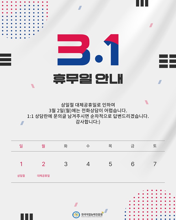 - 문의사항이 있으실 경우, [1:1상담]에 남겨주시면 3월 3일(화) 업무 시간 중 순차적으로 빠른 답변드리겠습니다.